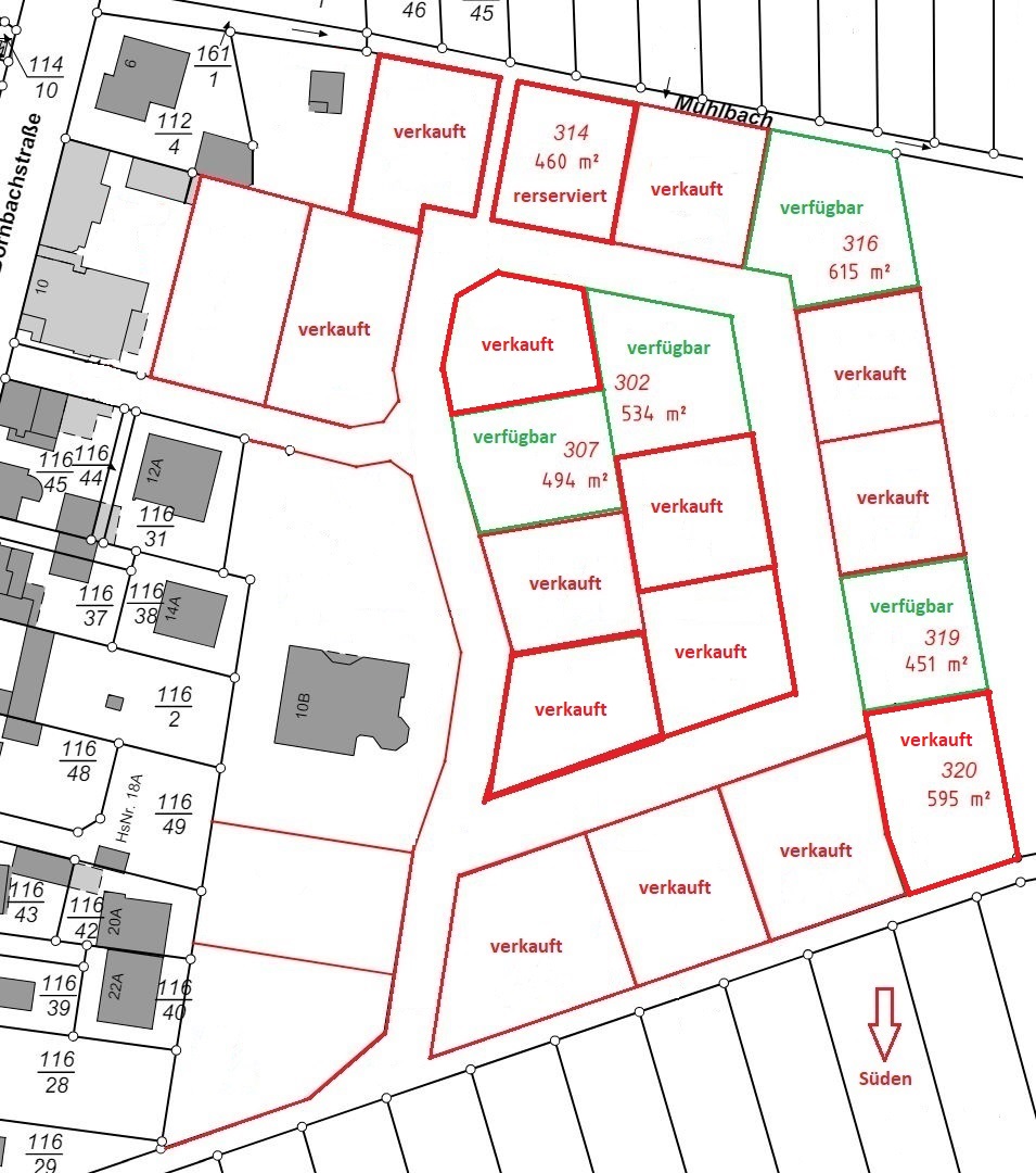 Derzeit stehen folgende GRÜN UMRANDETE Grundstücke zur Vermarktung. Stand 03.11.2024